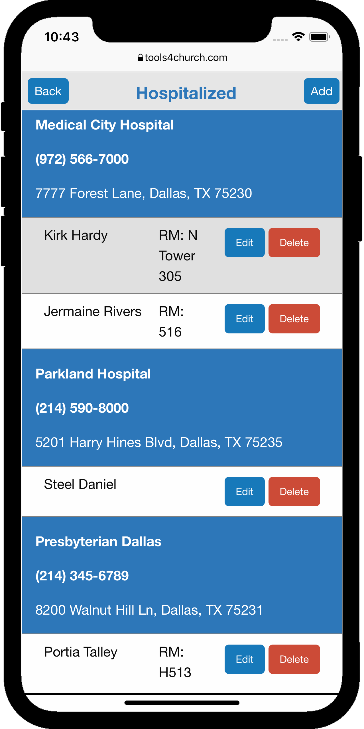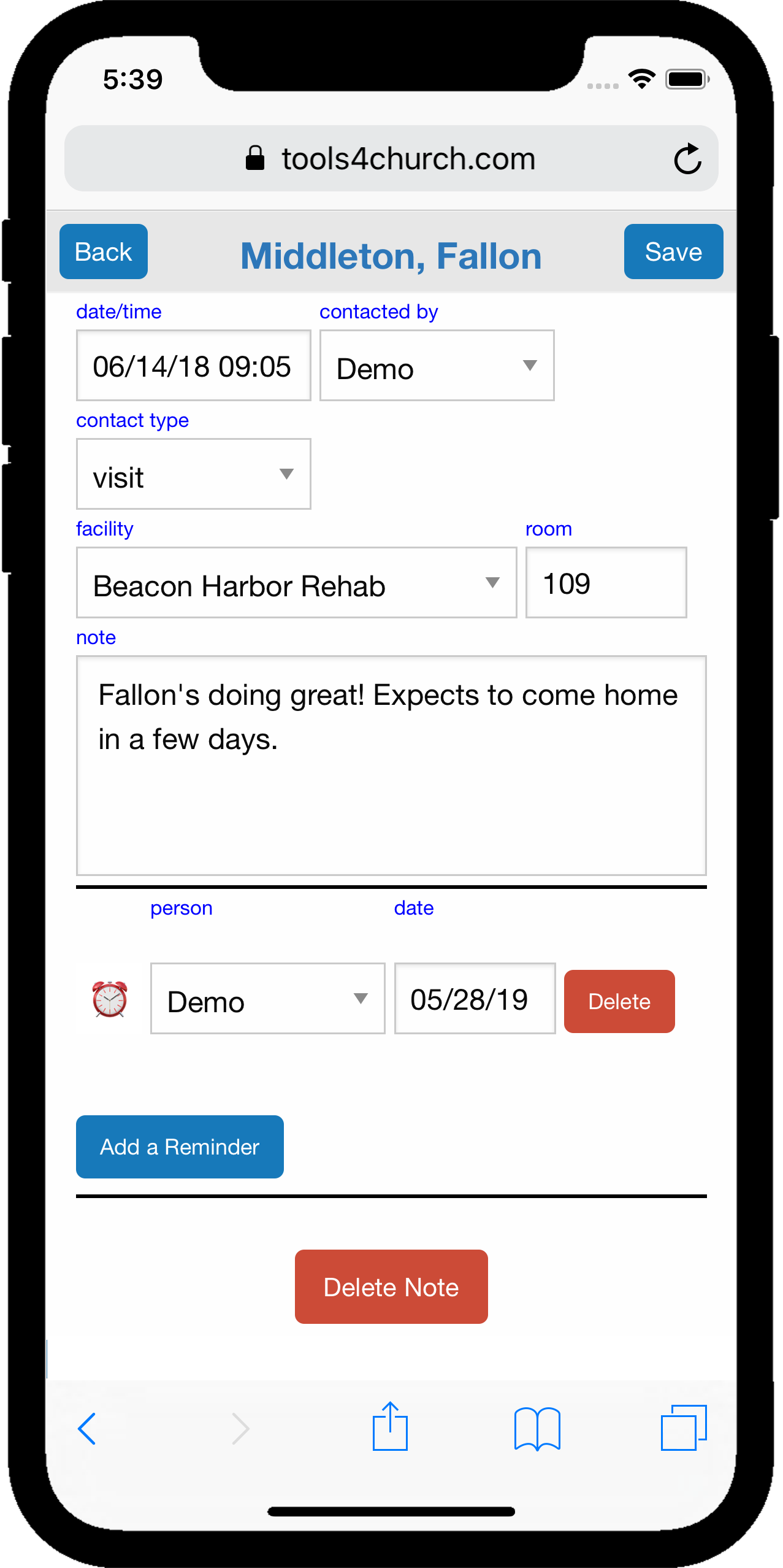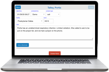 Take and share pastoral care notes and set reminders for follow-up, track hospitalizations, rehab stays, homebound lists, and more.